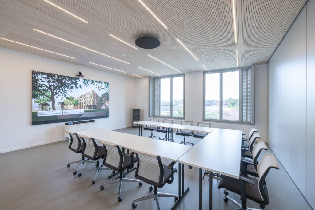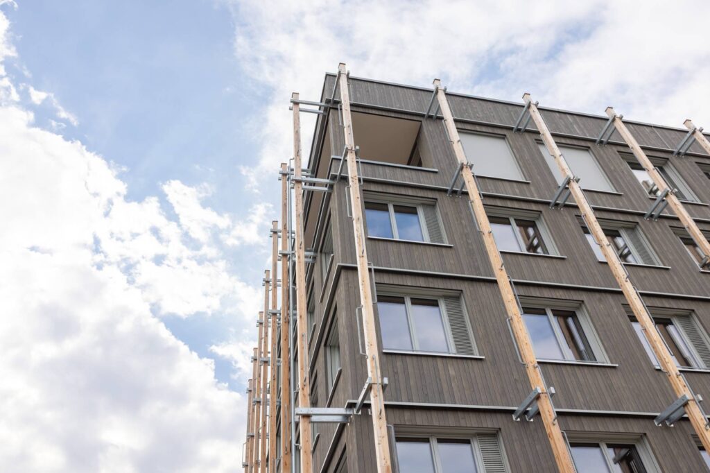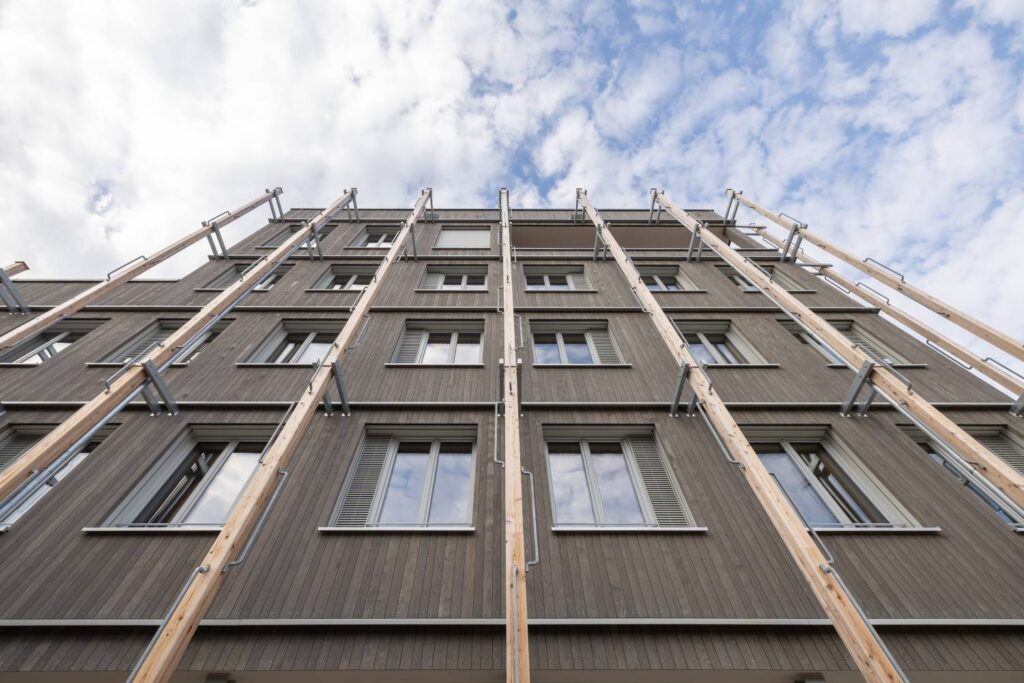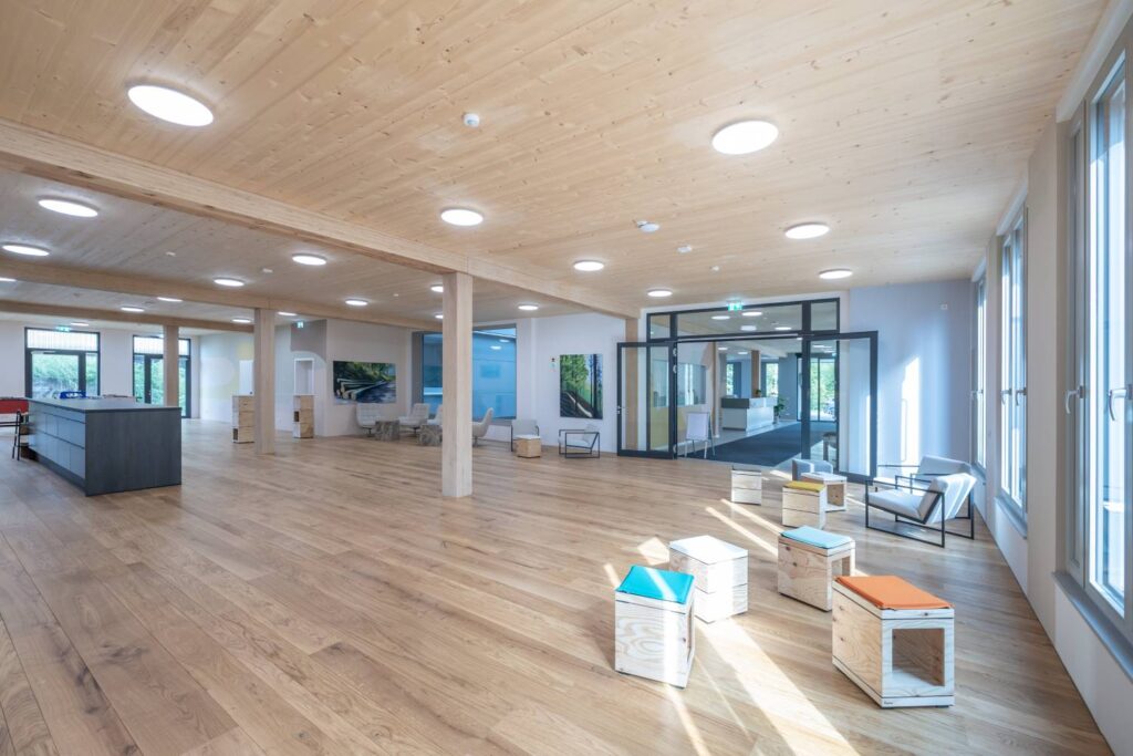 Durch das frühe Einbinden der Holzbau Südwest in die technische Ausgestaltung des Gebäudes war es möglich, statische, akustische und brandschutzrelevante Anforderungen rechtzeitig in die Planung zu integrieren. Die enge Zusammenarbeit zwischen dem Architekturbüro Waibel & Waibel aus Biberach, der Stadt Offenburg, der TPO sowie den Firmen des Generalunternehmens Holzbau Südwest erwies sich als besonders pragmatisch und konstruktiv. Dadurch konnten intelligente Lösungen gefunden werden, die sich in der Praxis problemlos umsetzbar, nachhaltig und kostengünstig realisieren lassen. So wurden Holzskelett-, Holzrahmen- und Brettsperrholzbauweise kombiniert, was es ermöglicht hat, das Gebäude komplett in Holz zu bauen. Dabei fertigten Burkart Haus und Holzbau Bruno Kaiser je zur Hälfte die Außenwände und Steiger & Riesterer produzierte die Innenwände inklusive Treppenhaus und Liftschacht in Brettsperrholzbauweise.