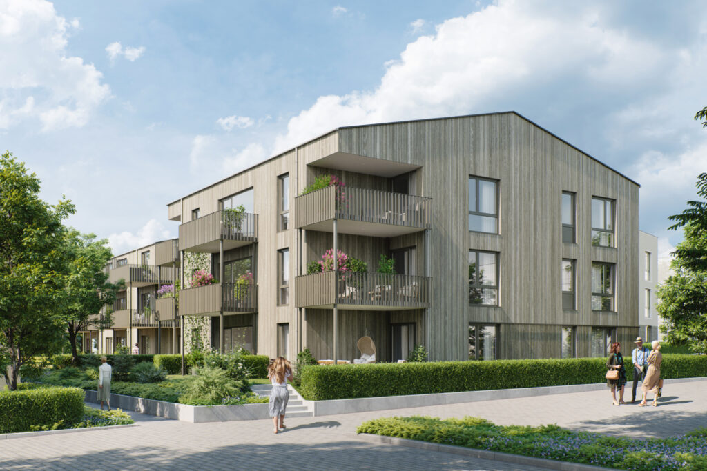 In Ehrenkirchen, am Rande des Markgräflerlands, entsteht im ersten Bauabschnitt ein modernes Wohnquartier mit drei Mehrparteienhäusern. Zwei der Gebäude werden teilweise in Holzbauweise erstellt und erhalten eine Schalung aus heimischer Weißtanne. Auf insgesamt je 646 m² Wohnfläche und drei Stockwerken finden neun Eigentumswohnungen unterschiedlichen Zuschnitts Platz. Die 1,5- bis 4-Zimmer-Wohnungen in den klimafreundlichen Wohngebäuden profitieren vom EH 40 Standard und sind somit förderfähig.